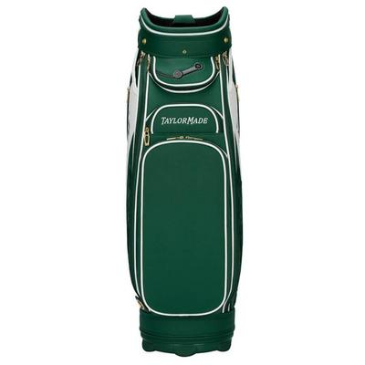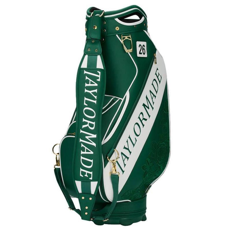 Gold detailing across the zips, buckles, and hardware adds a refined finish, elevating the overall aesthetic. The TaylorMade script is set cleanly against a white backdrop, delivering a bold yet classic visual that mirrors the traditions of the tournament.